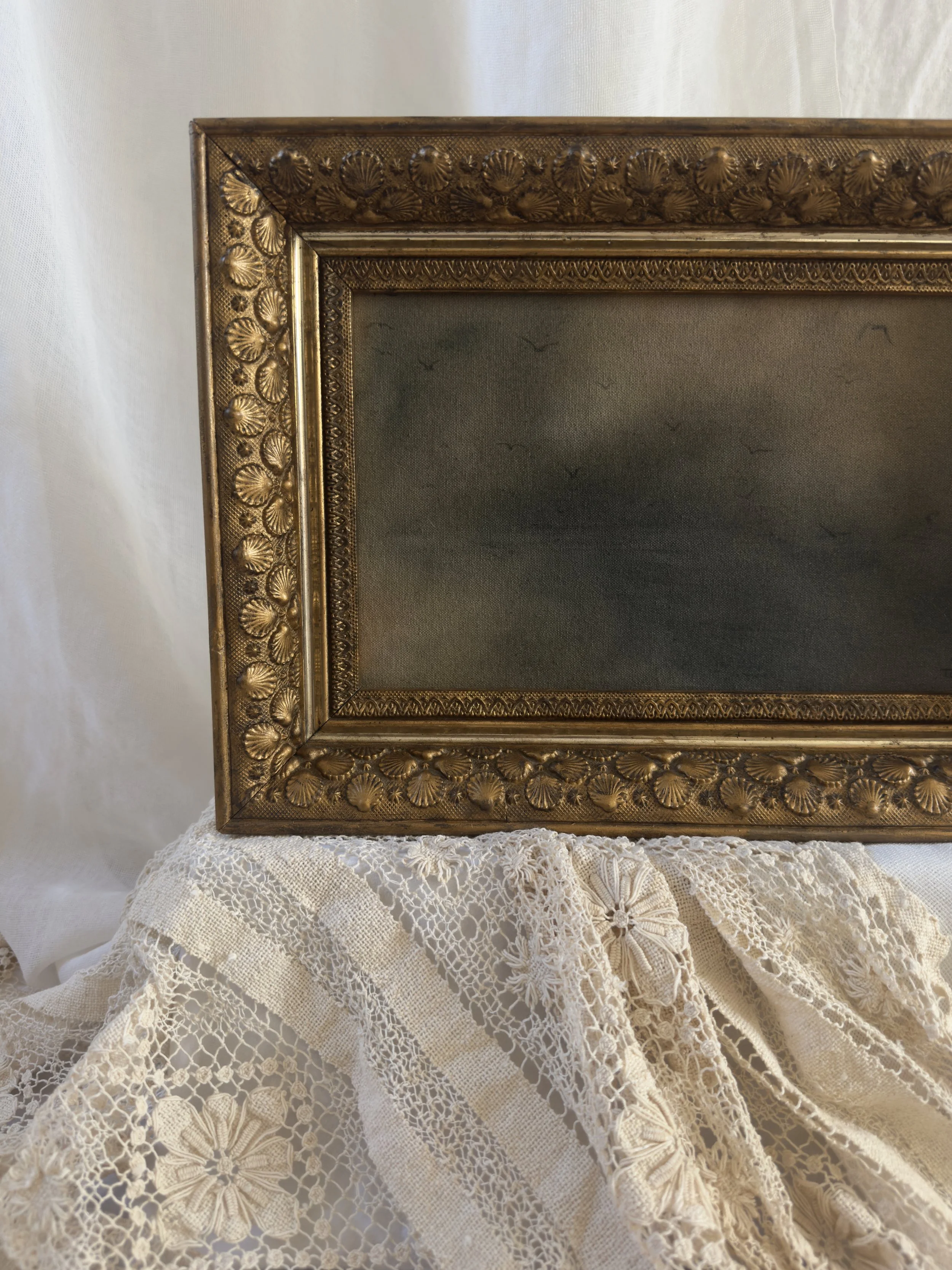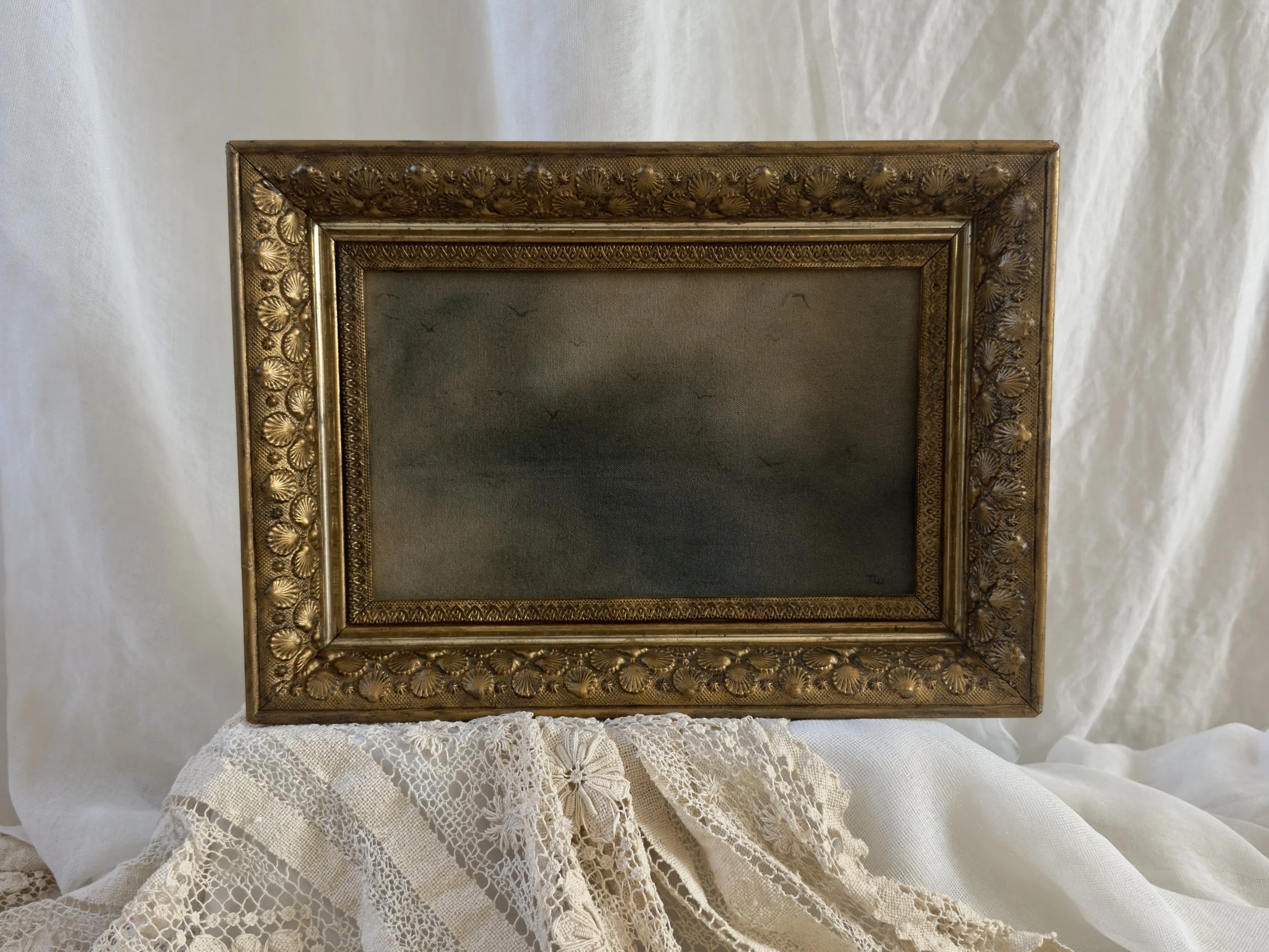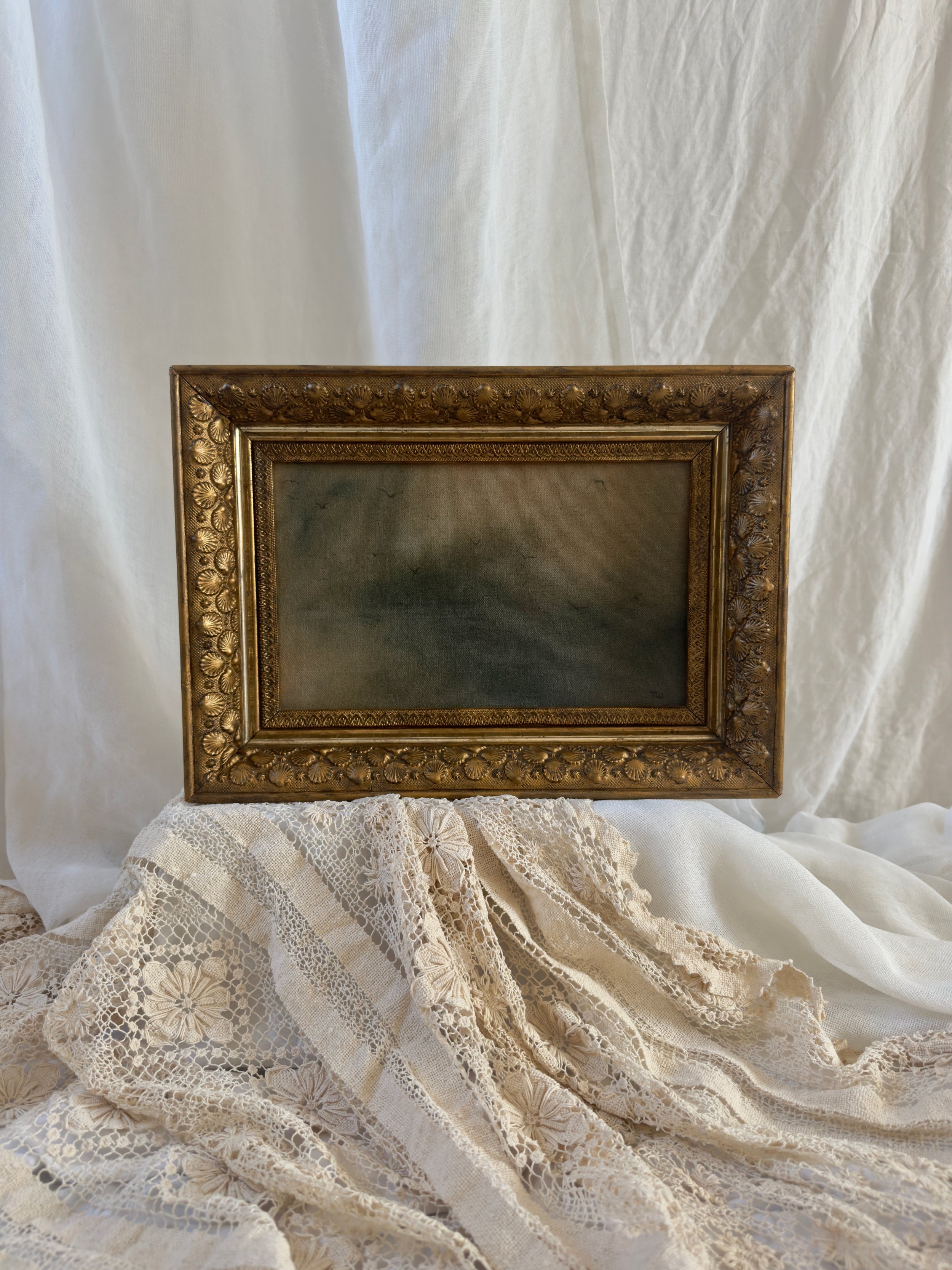 Framed in a one-of-a-kind antique gold gesso frame.