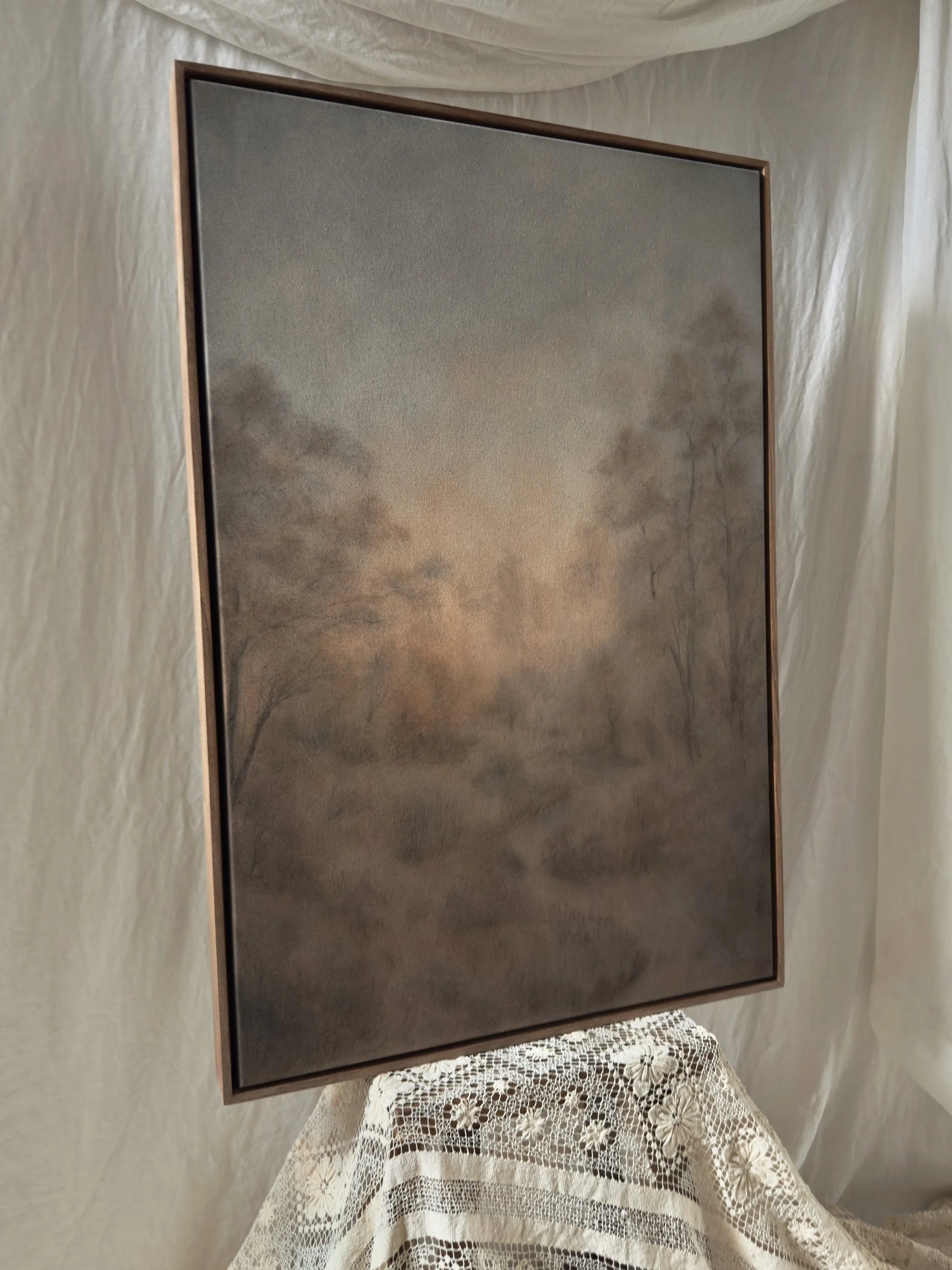 Framed in waxed walnut.
