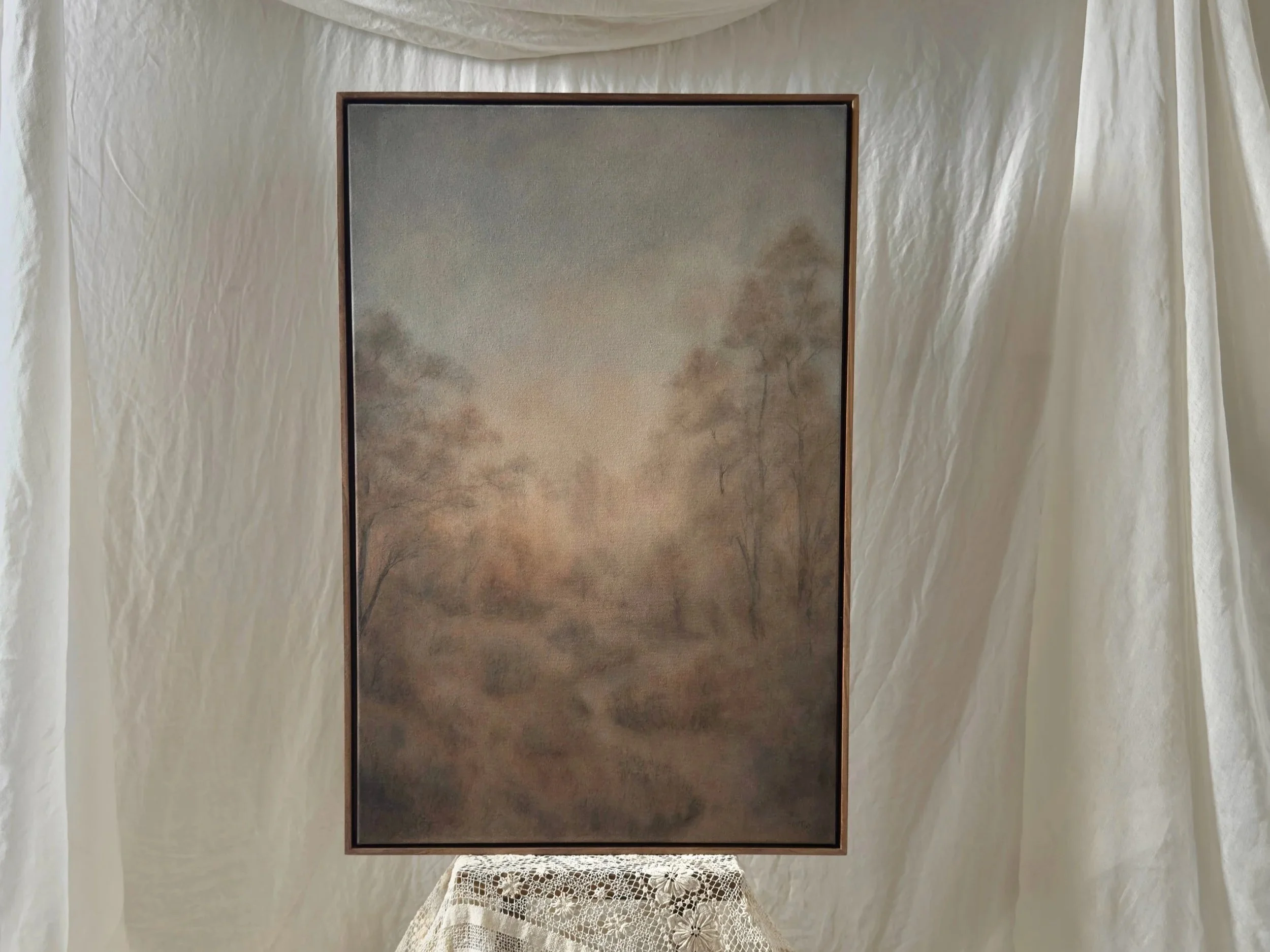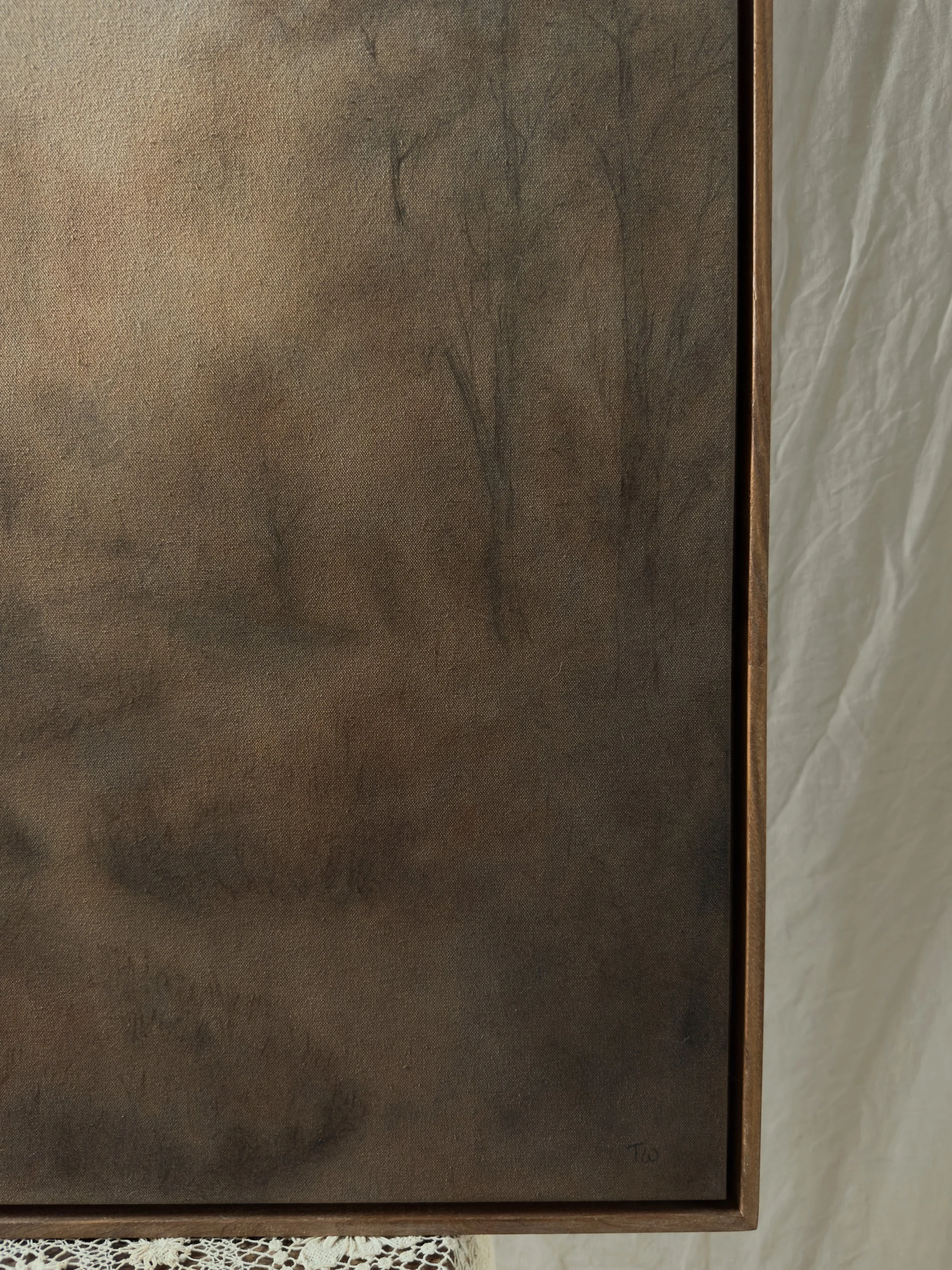 Painted with natural, earth pigment paint, oak gall ink, pastels and pencil on raw canvas.